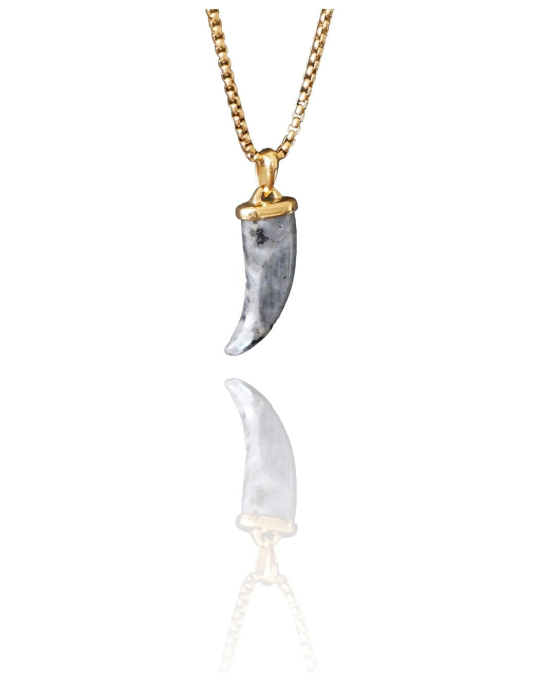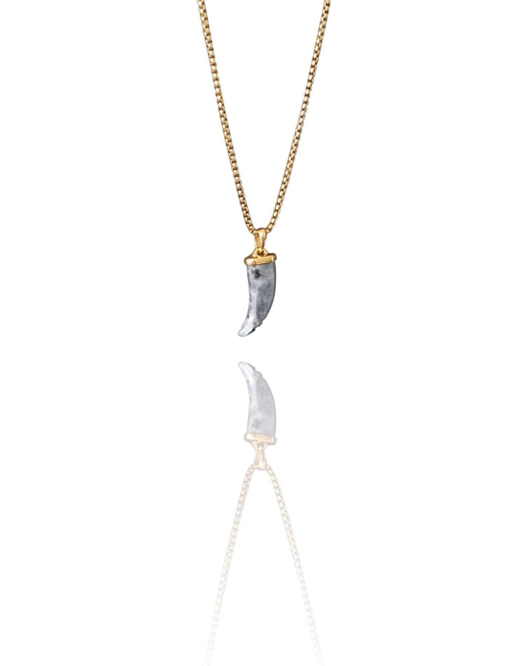 ¡Descubre el pendiente perfecto para el hombre audaz y sofisticado que aprecia el poder y la elegancia en cada detalle! En Silver Back, te presentamos una joya que combina diseño y simbolismo: un pendiente con una cadena y estructura dorada, adornado en el centro con un colmillo de piedra Ágata Gris.