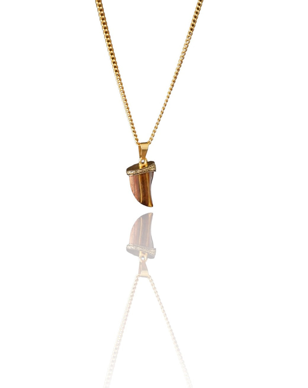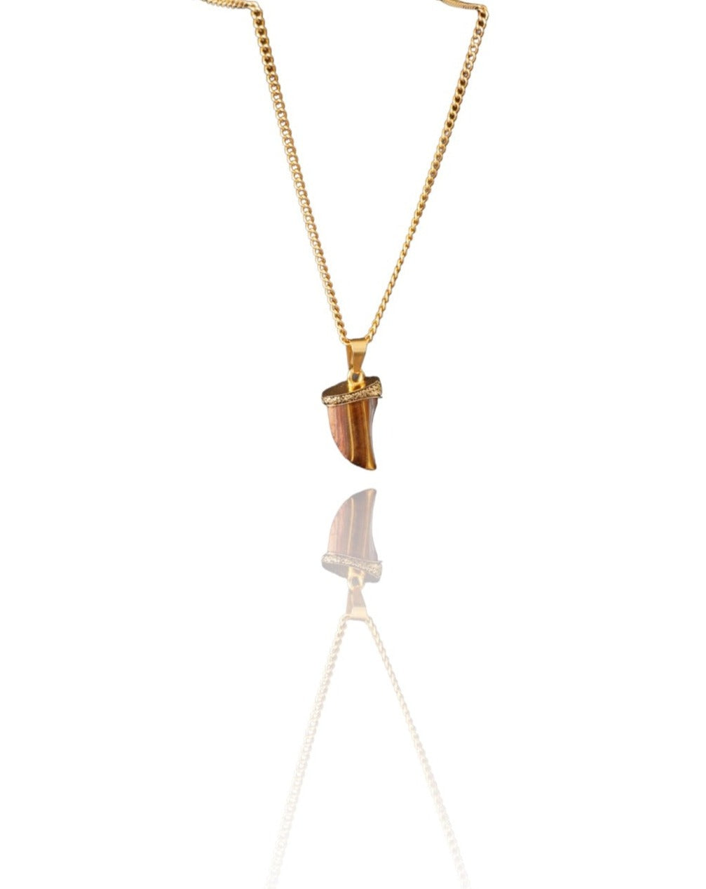 Imagina llevar este pendiente y sentir cómo tu energía se eleva, envolviéndote en una aura de seguridad y determinación. La estructura dorada resplandece con una elegancia inigualable, destacando tu estilo con un lujo discreto pero impactante. En el centro, el diente de tiburón de Ojo de Tigre no solo capta todas las miradas, sino que también actúa como un talismán de fuerza y protección.